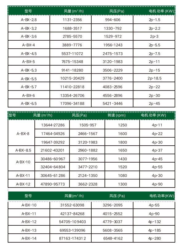 A-BX型离心通风机,适用于工矿厂房,科研机关及大型公共建筑物通风换气,即可用作输入气体,也可用作输出气体,输送的气体不超过80摄氏度的空气和其他不自燃的,对人体无害,对钢铁材料无腐蚀气体,气体内不许有粘性物质,所含的尘土及硬质颗粒物不大于150mg/m3。